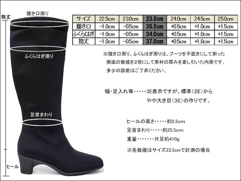 素材 アッパー:ストレッチ素材+ゴアテックス アウトソール:合成ゴム+グラスファイバー底全体の長さ:約42.5cm(筒丈:約37cm+ヒールの高さ:約5.5cm)履き口周り:約35.5cmふくらはぎ周り:約34.0cm重量:片足約410g※各数値はいずれもサイズ23.5cmで計測した場合。