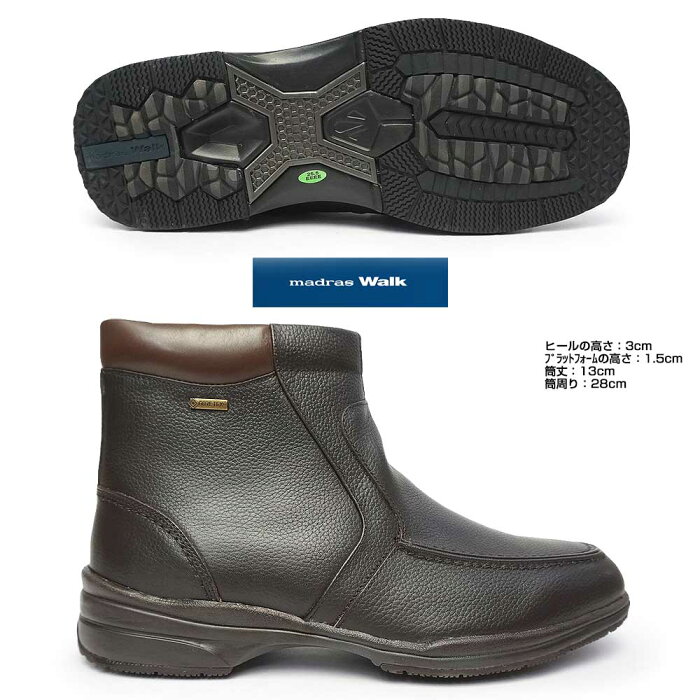 幅、足入れ等幅・・・4E(ゆったり)ヒールの高さ: 3cm、プラットフォームの高さ:1.5cm筒丈:13cm、筒周り:28cm素材 アッパー:本革 アウトソール:合成重量 431g(27.0cm片足で計測)原産国 中国紳士 靴 ハイドロストッパー シュリンク 防寒 耐滑 ブラック ブラウン BLACK BROWN BLA BRN ギフト 誕生日 プレゼント 父の日 敬老の日madras Walk GORE-TEX【smtb-TK】 25.0cmで程よく余裕がありちょうど良いサイズでした。