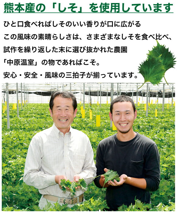 この風味の素晴らしさは、さまざまなしそを食べ比べ、 試作を繰り返した末に選び抜かれた農園「中原温室」の物であればこそ。