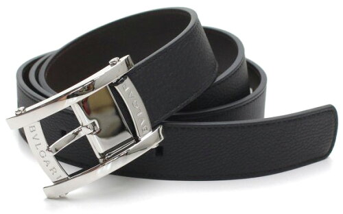 BVLGARI ブルガリ メンズベルトブラック×ダークブラウンエンボスロゴ刻印バックルグレインレザー 型押し×スムースカーフレザーベルトカット可能 プラスパラジウムプレート金具アショーマ ビジネス用としてオススメフリーサイズ アショマベゼル